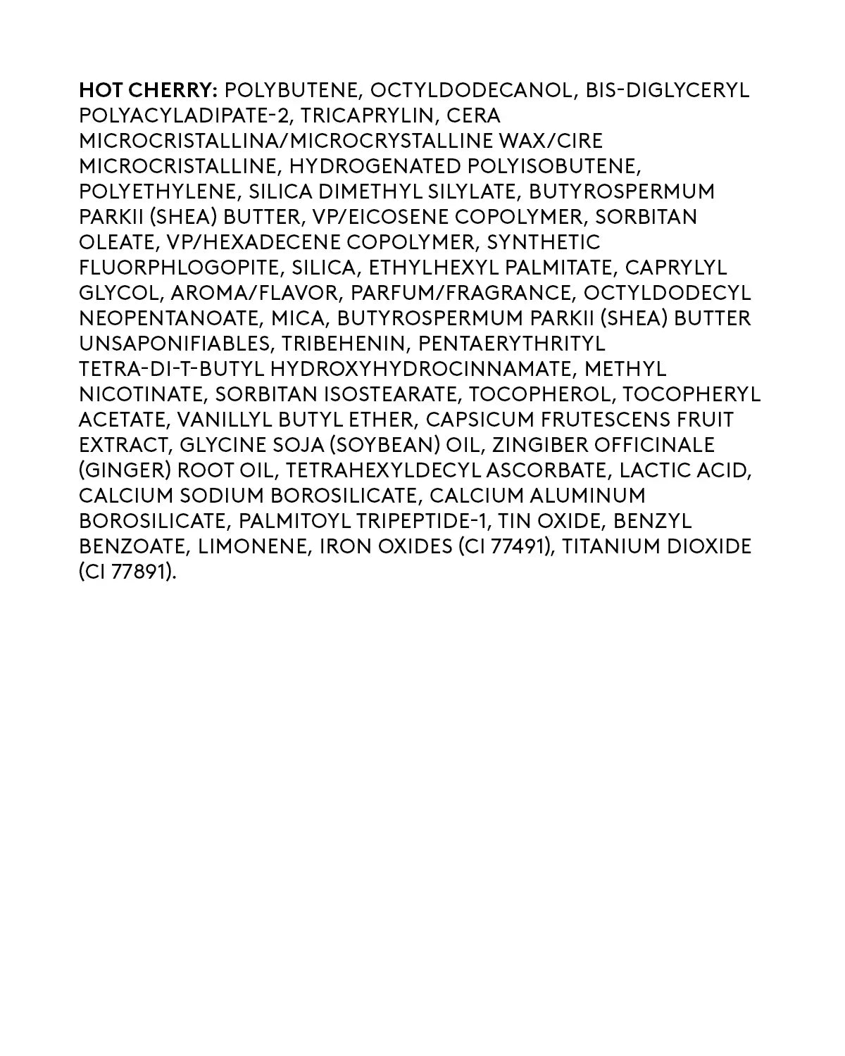 • With Plump Job Complex, an innovative blend of ingredients, including ginger root oil and capsicum fruit extract (pepper), to gently titillate and plump lips