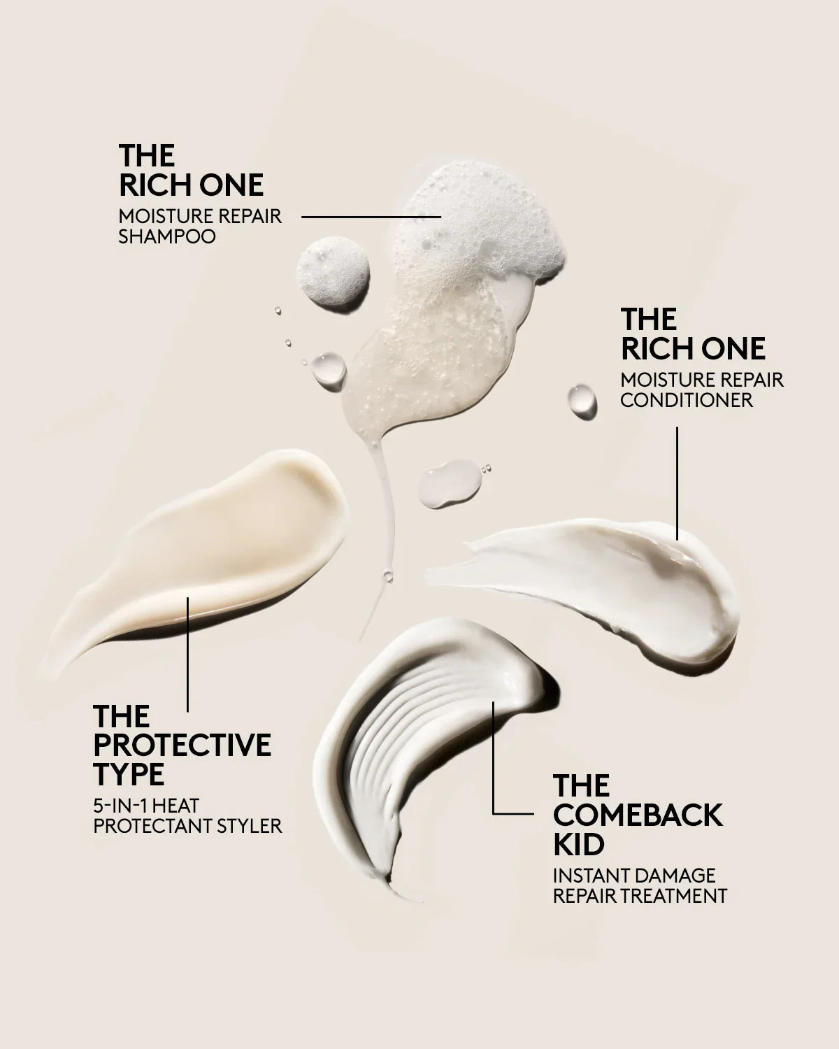 The Rich One Moisture Repair Conditioner: After shampooing, apply to damp hair, focusing on the mid-shaft and ends. Rake through to ensure even distribution. Rinse well.