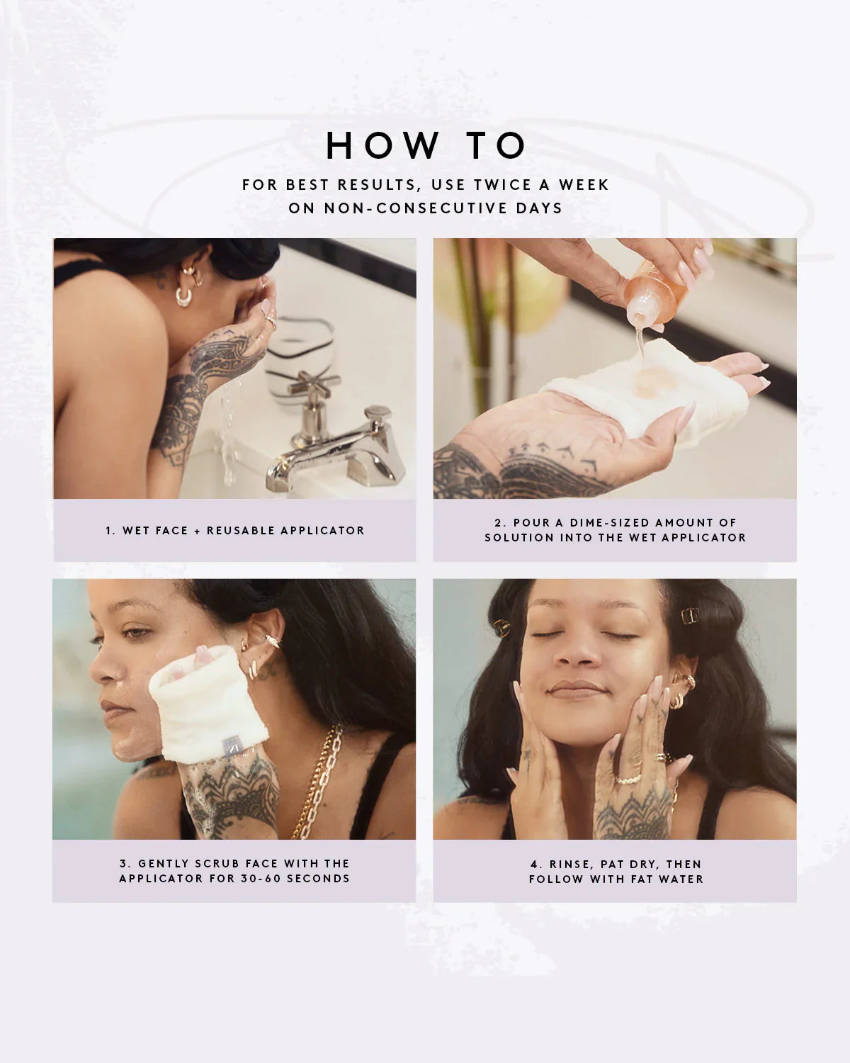 Wet reusable applicator and your face with water (we love to use it in the shower!). Pour a dime-sized amount of solution into the center of the wet applicator. Gently scrub face with the applicator for 30–60 seconds, working the solution into a plush lather. Rinse, pat dry, then follow with toner. If using during the day, make sure to follow up with Hydra Vizor to protect your skin from the sun as AHAs can increase UV sensitivity. If using at night, make sure to remove your makeup beforehand with Total Cleans'r, and then follow up with Instant Reset after use.