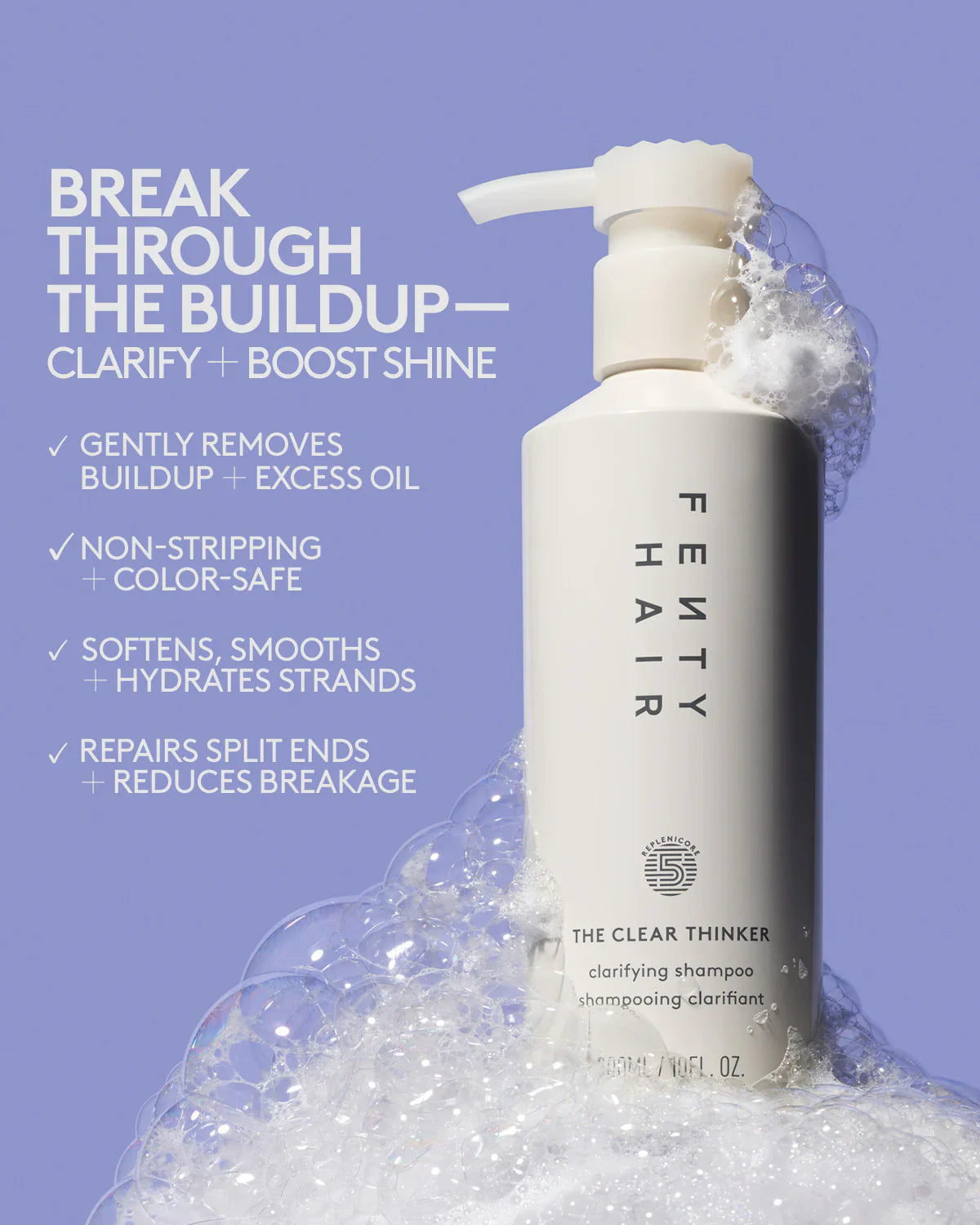 The Clear Thinker Clarifying Shampoo is ideal for all hair types and textures that experience excess product buildup, oily or dull, lifeless strands.
