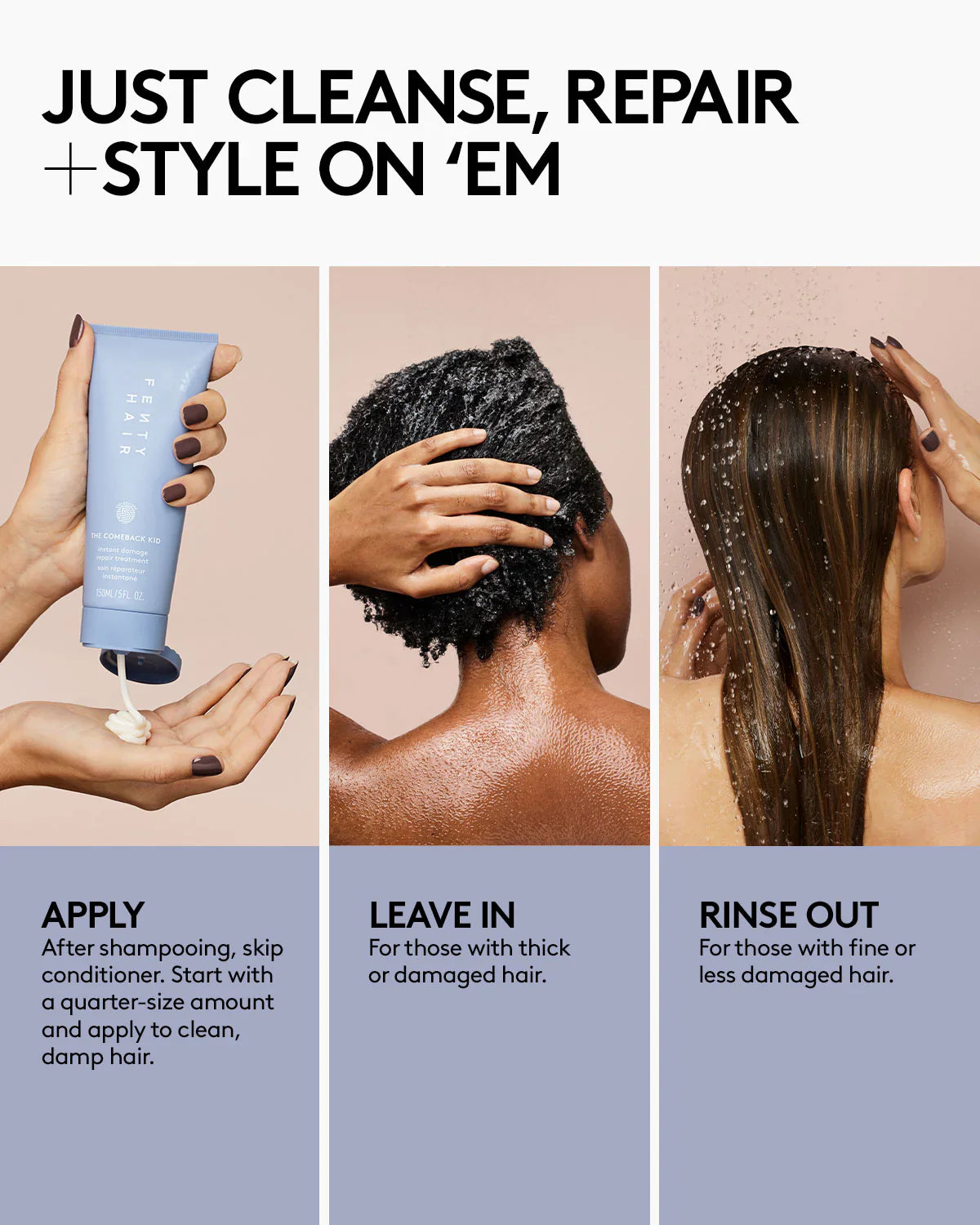 You’ve heard the bond-building hype, now get ready for professional-grade bond repair without the complicated steps—or breaking the bank. The Comeback Kid penetrates deep into the cortex to provide instant inside-out repair, support damaged keratin structures and strengthen strands. With the help of our proprietary bond-building formula, powered by amino acids—the building blocks of proteins—chia seed extract, and our unique complex, Replenicore-5, you’ll see up to 75% improvement in damage* and up to 72% stronger hair*. Hair instantly looks and feels healthier, moisturized, softer and smoother with just one use. It also can be used as a leave-in or rinsed out so adding it to your routine is too easy. Simply cleanse, use in place of your conditioner + style on 'em.