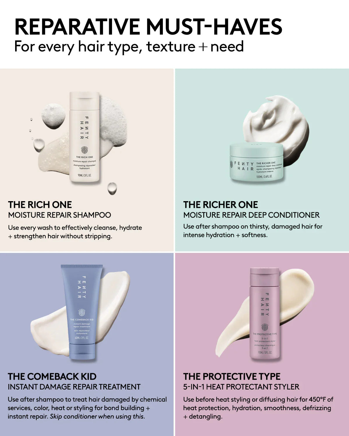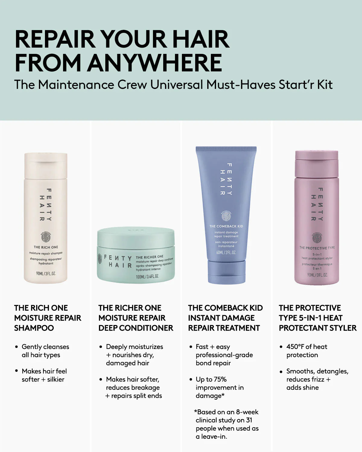 The key to endless looks? Universal must-haves that repair, strengthen and nourish. We developed The Maintenance Crew, a set of shampoo, deep conditioner, bond-building treatment and a heat protectant styler (in travel-friendly sizes) to carry you across the finish line—no matter your hair type or texture. All infused with our unique complex, Replenicore-5, they’re designed to repair at every step.